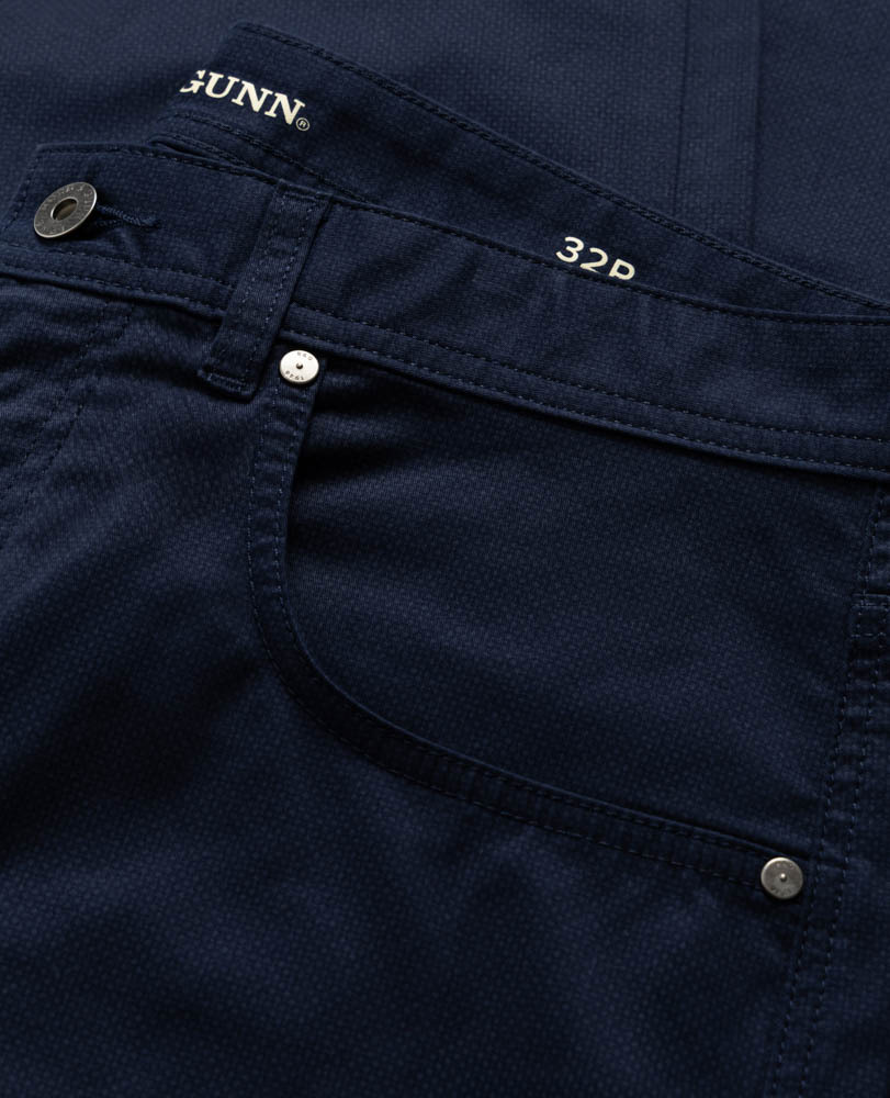 A new wardrobe staple, our Broadway Street jean, features a subtle print that adds dimension to this cotton-blend fabric. A relaxed fit, with a hint of stretch allows you to keep comfortable while maintaining a refined look. Stitched with felled seams for added durability, and furnished with antique rivets and tac button.