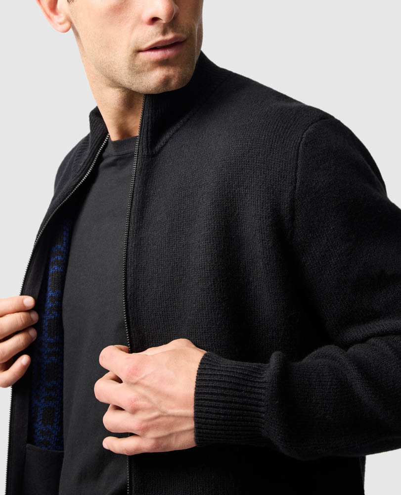Elevate your wardrobe with this finely crafted zip-front knit. Made from a luxurious blend of fibers, it features refined detailing, and a double faced knit with check jacquard reverse. Adaptable with a zip front, this versatile piece is Ideal for layering over shirts or under coats.