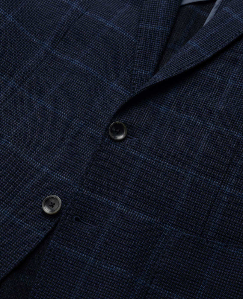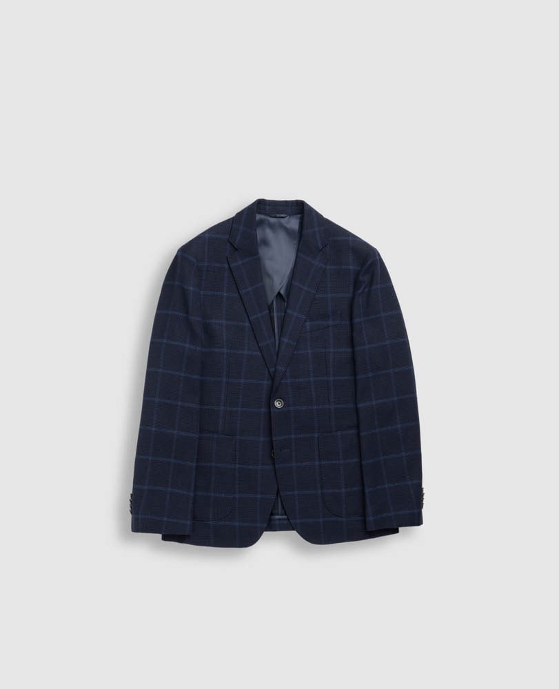 Elevate your style with a soft tailored jacket boasting a luxurious jewel-toned check texture made from a premium wool viscose blend with added stretch for comfort. This lightweight jacket offers a comfortable deconstructed design while exuding sophistication.