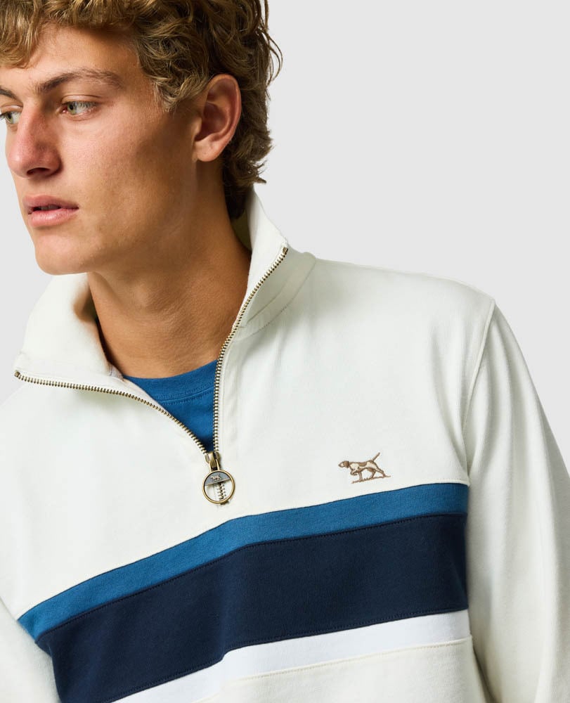 Built from 380gsm heavyweight Australian Good Earth Cotton, the Chesterfield sweat blends old-school durability with modern comfort. The tightly knit rugby fabric structure resists pilling while maintaining a naturally breathable hand-feel. Cut in our iconic 1/4 zip style with contrast chest stripes and sportswear detailing, it’s a versatile layer designed for everyday wear with the quiet confidence of real sports provenance.