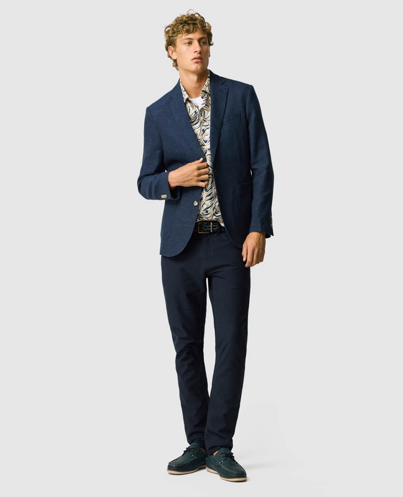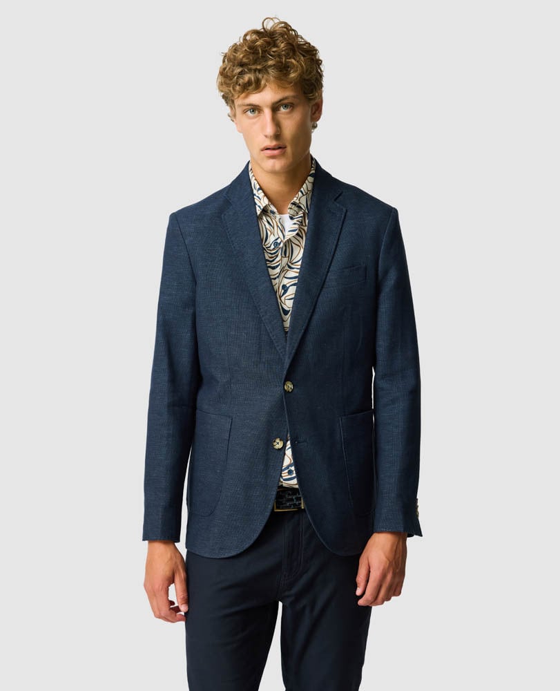 This jacket is crafted from a cotton-linen blend, textured fabric in a versatile midnight blue. Expertly crafted in our deconstructed make with natural shoulder padding, which lends the jacket a relaxed yet sophisticated look.