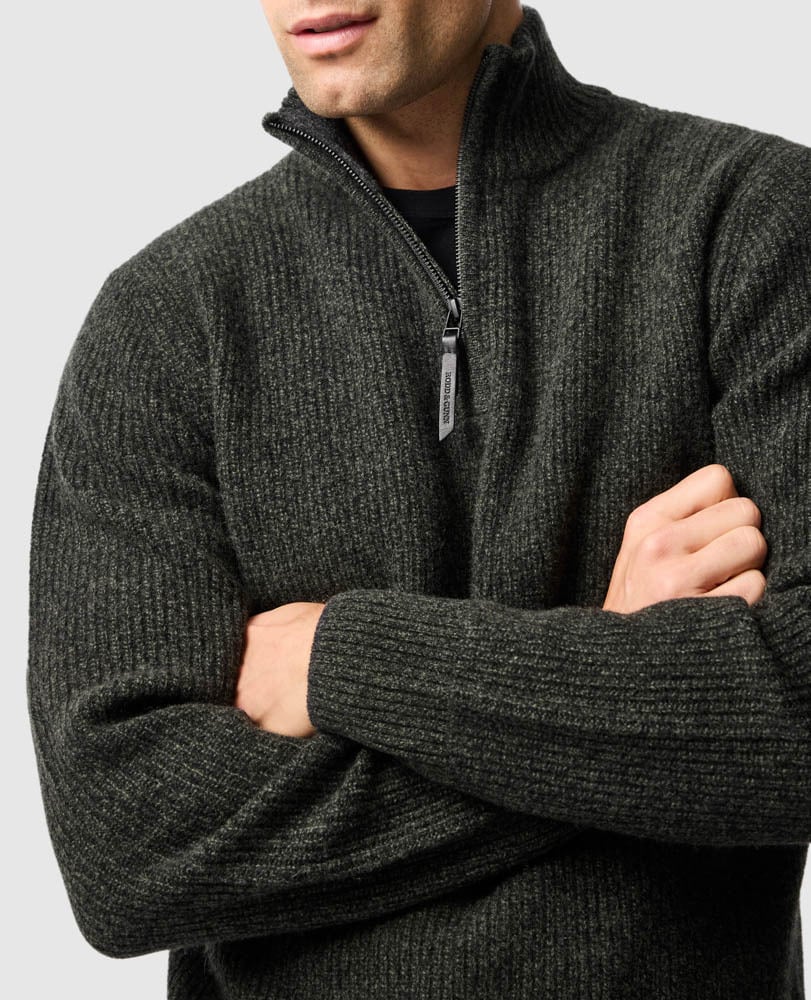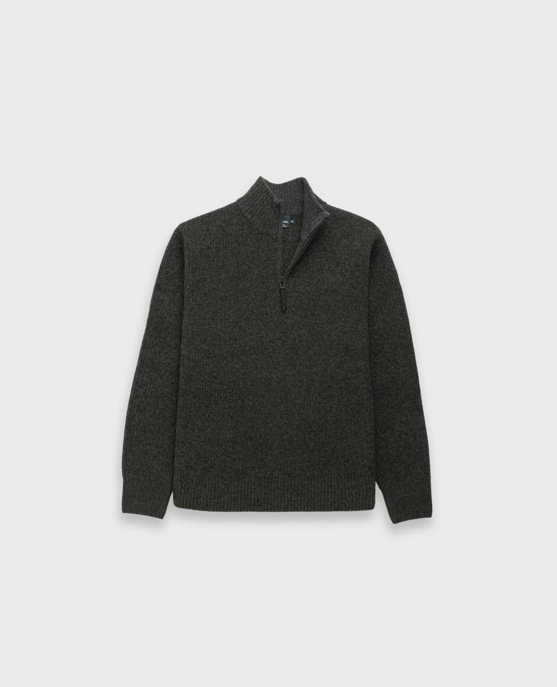 This sweater is expertly crafted from an extra fine lambs wool, textured with a melange yarn. Spun in Italy, knitted with a rib texture on the body, jersey side seams and sleeves, and trimmed with premium YKK zip front.