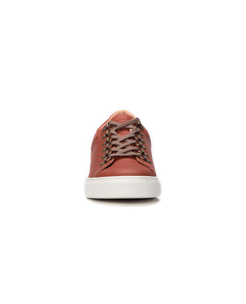 The Glone Sneaker is defined by it's hiker style eyelets, these are finished in antique brass and offer a unique lace up style for a sneaker. The taupe laces offer a muted contrast to the striking uppers which feature a distinct yellow highlight at the heel. Leather lined and with a padded collar this will be an easy wearing sneaker with significant interest.