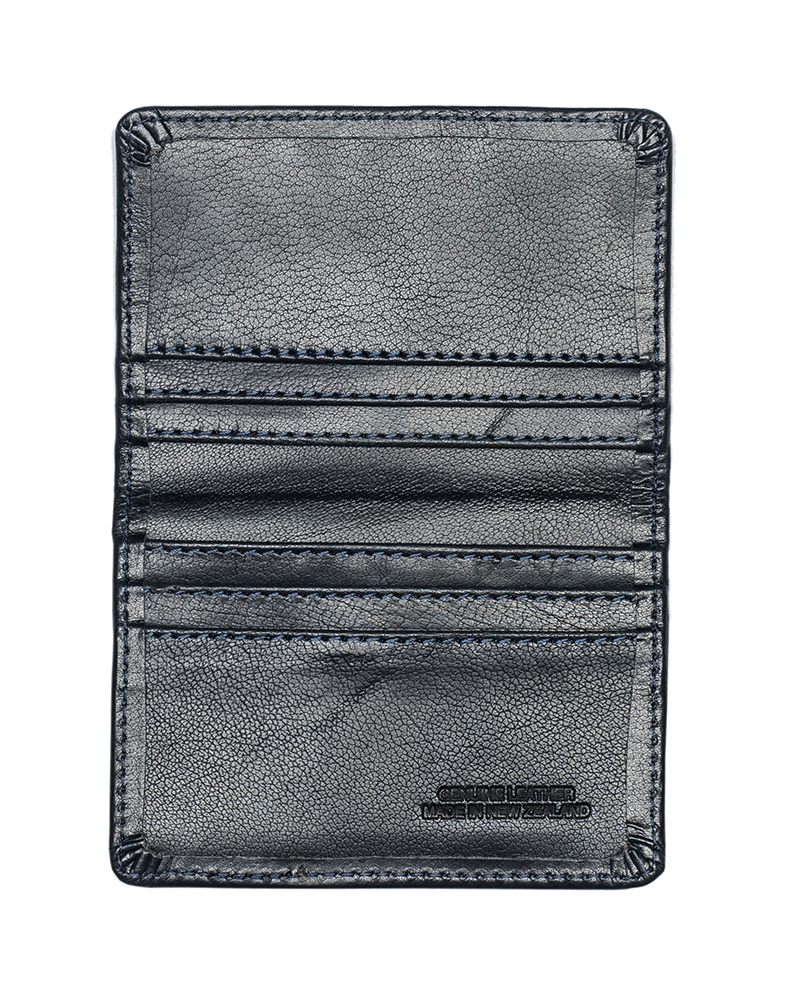 Buffalo leather landscape fold credit card wallet, hand-crafted in New Zealand. The wallet features six slots for credit cards in its compact form.