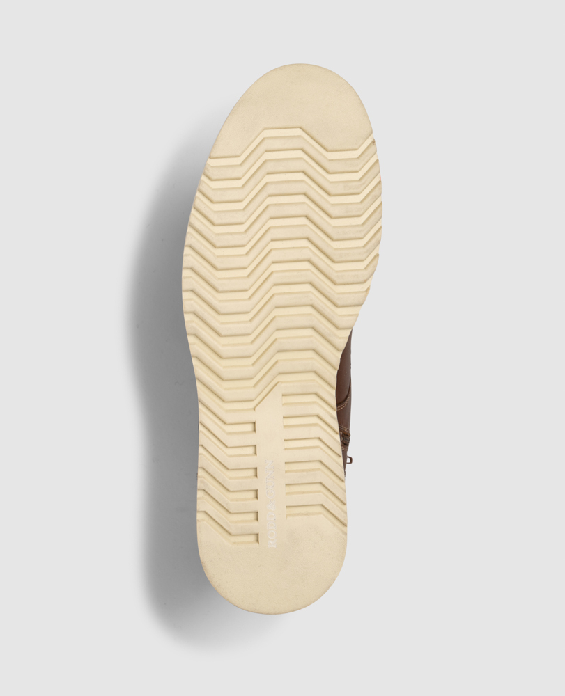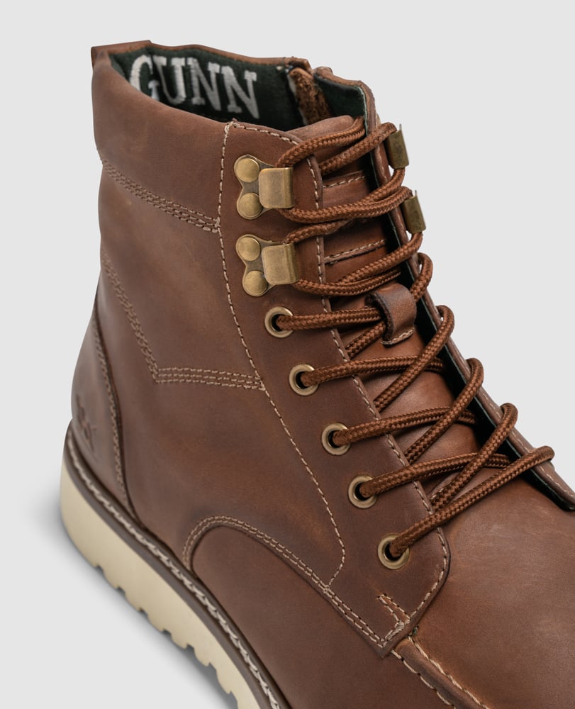 The Milton Street Utility boot features an oiled cow leather upper, full leather lining with a removeable footbed, and a rubber outsole. Key design Features of the Milton Street are the moccasin vamp treatment, the bold contrast stitching and the fashion forward chalk coloured wedge lug outsole. The five eyelet plus 2 hook lace system adds both style notes and effortless function. The Milton Street can be paired with denim, chino's or shorts.