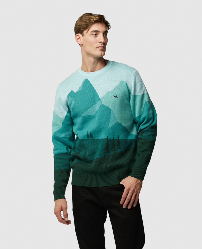 Ce chandail saisissant est fabriqué à partir de fils de coton de qualité supérieure avec un motif des montagnes de Queenstown, la maison emblématique du Lodge Bar phare de Rodd & Gunn.