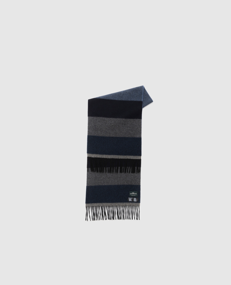Der in Italien aus Schurwolle gefertigte Frankton Schal mit charakteristischen Fransen besticht durch markante Streifen in tonalen Farben.