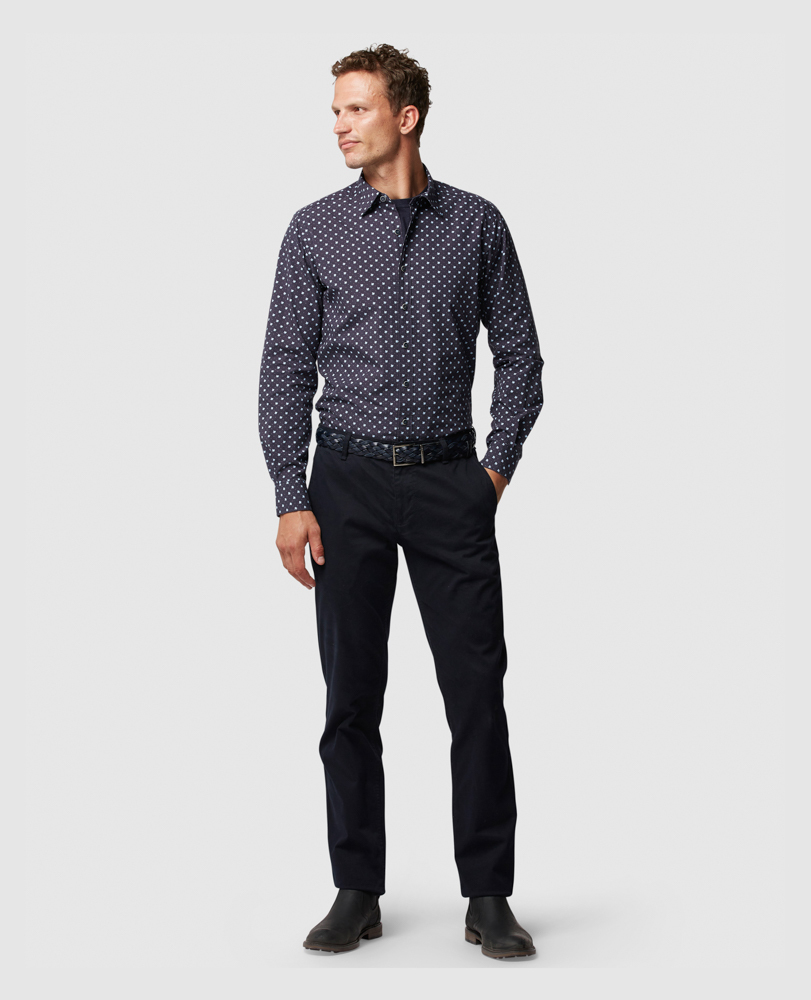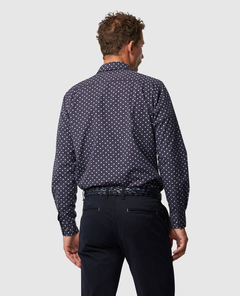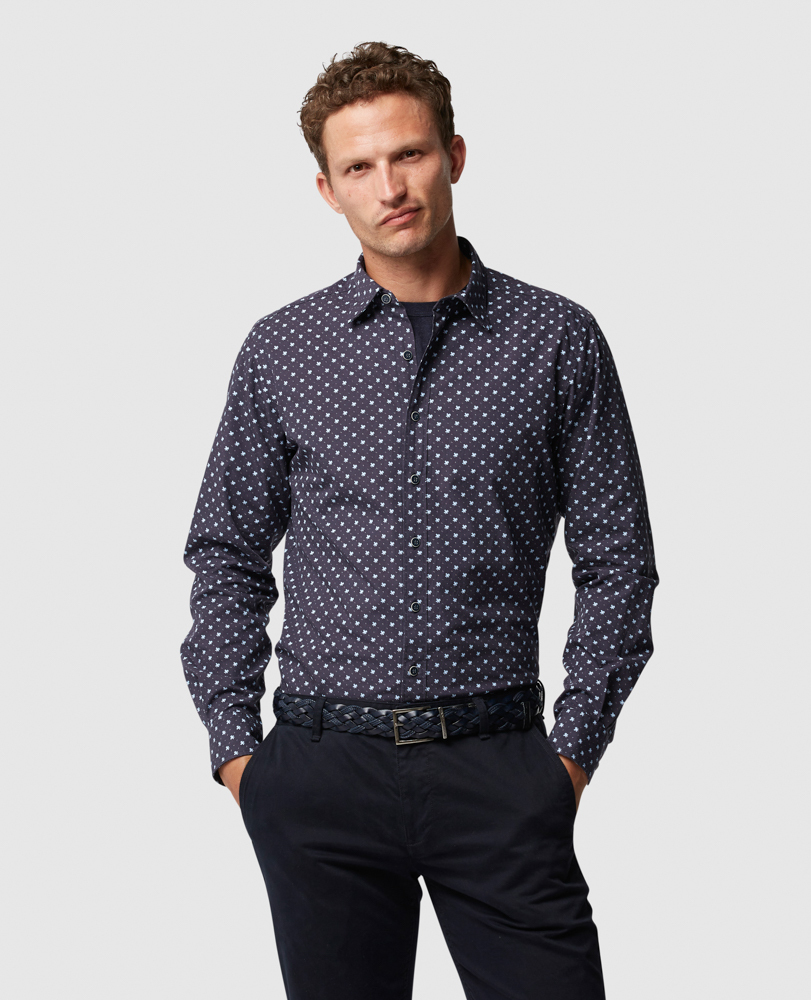 This geo print shirt offers a smart alternative to stripes and checks, and is guaran-teed to make an impact over the colder months in its versatile navy colour. The fabric was expertly milled in Italy, made with meticulous attention to quality and prewashed for softness.