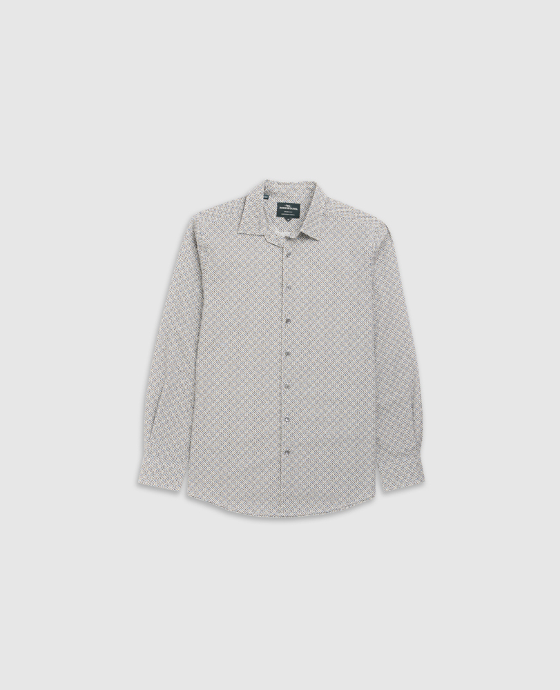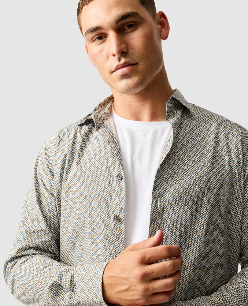 Verleihen Sie Ihrer Garderobe mit diesem vielseitigen Langarmhemd mit Blätter-Print in neutralen und blauen Farben auf weißem Untergrund einen eleganten Touch. Aus besonders hochwertigem, leichtem Baumwollstoff in Europa gefertigt.