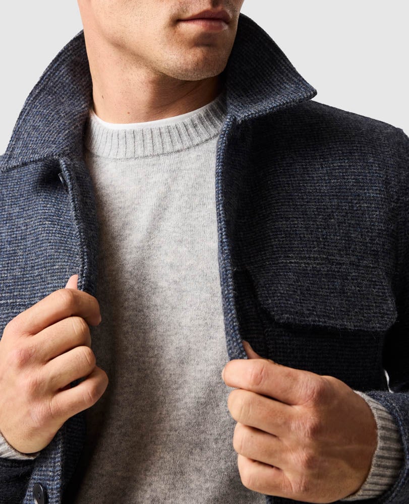 This classic trucker jacket features a subtle micro check adding depth and texture. Made from expertly milled virgin wool fabric in Northern Italy, it provides warmth and durability. The jacket is lined with a premium lining for added comfort and features modern styling, four external pockets and one internal pocket for added functionality.