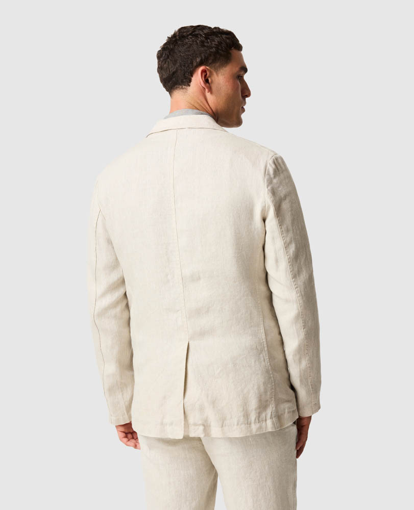 Crafted from raw flax grown in the Europe, the Resort Linen jacket delivers uncompromising warm-weather sophistication with its unlined construction and fuller silhouette that embodies refined casualness. Available in three sophisticated colourways, this versatile jacket can be paired with either our traditional tailored trousers for classic elegance, relaxed easy-waist pants for modern comfort, or coordinating shorts for bold summer statements. The jacket transforms seamlessly from formal occasions with a crisp shirt to contemporary settings with a premium polo or carefully selected t-shirt, making it the ultimate wardrobe solution for discerning gentlemen who refuse to compromise on style when the mercury rises.