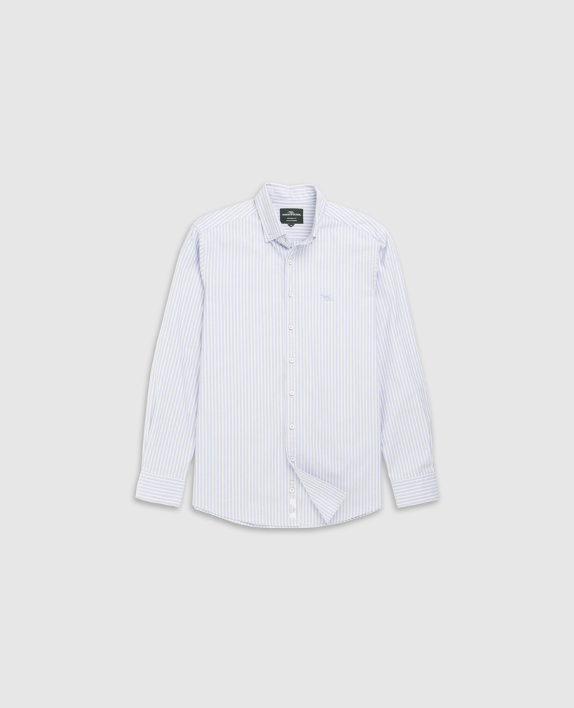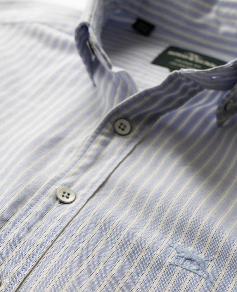 Stripes mean business, and this textured-look regimental stripe is no exception. This fabric has been crafted in an oxford weave, created in a prestigious mill in Italy. Its washed 2-ply construction creates a soft, broken-in feel that will continue to soften over time with washing and wear.