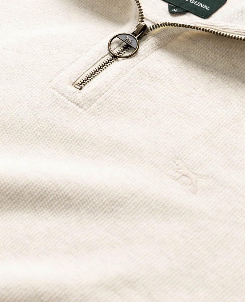 Our classic quarter-zip shape is reimagined in a pique brushed fleece. Featuring a high neck for added warmth. Wear it zipped up for a sleek look or unzipped for a more casual vibe. This version is adorned with the Rodd & Gunn logo embroidered on the chest.