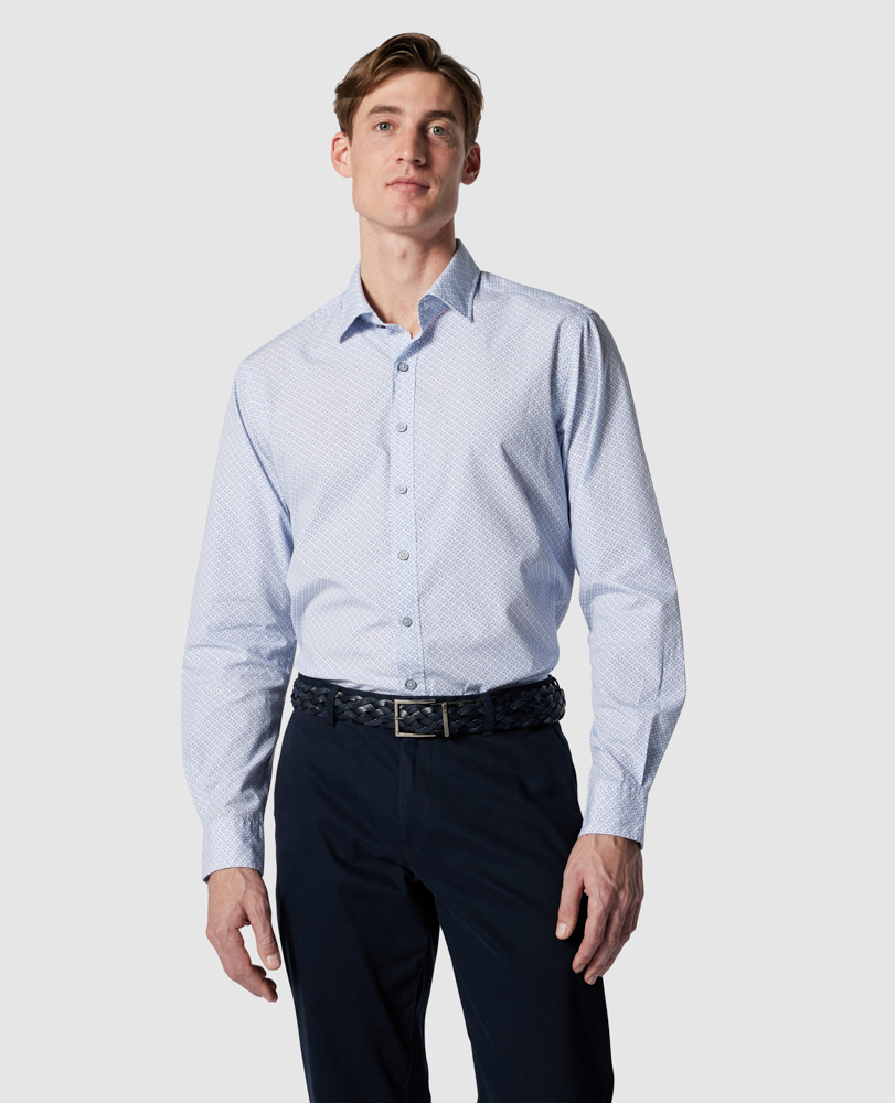 This lightweight poplin shirt is well-appointed with smooth Supima cotton yarns and woven in Northern Italy. Part of our luxurious Supima range, the fabric features a versatile geo-pattern, which is sure to make a statement and is pre-washed to further the inherent softness of the premium long-staple cotton.