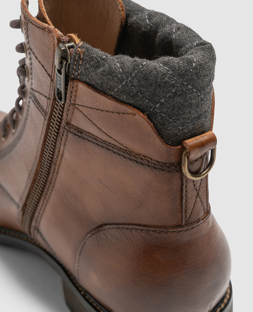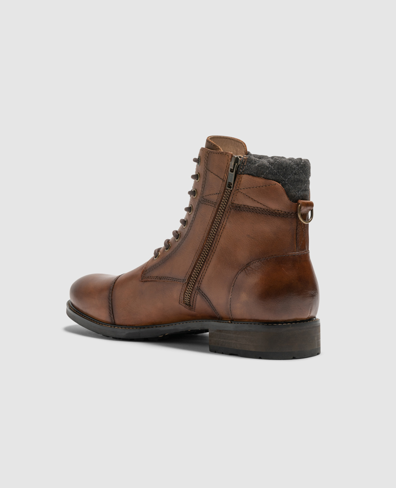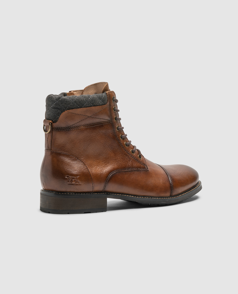 The David Field 2.0 boot is a eight eyelet lace up boot in a military style with toe cap detail. Ease of access is facilitated through side zip access and the upper is highlighted with a contrast, quilted fabric collar. Leather lined throughout, the upper is stitched down to a rigid, lightly cleated rubber outsole which will ensure longevity and wearability.