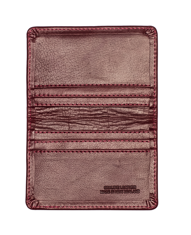 Buffalo leather landscape fold credit card wallet, hand-crafted in New Zealand. The wallet features six slots for credit cards in its compact form.