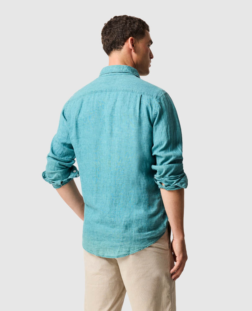This shirt is woven from yarns that feature a unique delave wash, which lends the fabric a slightly faded look and soft feel. Milled in Italy, from premium linen harvested in France and Belgium and certified by European Flax. Pre-washed for easy going feel, the fabric will continue to soften over time and with each and every wash.