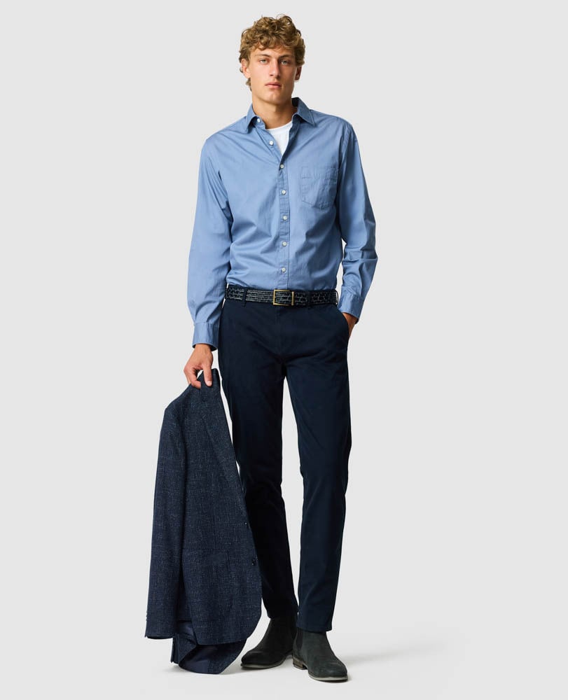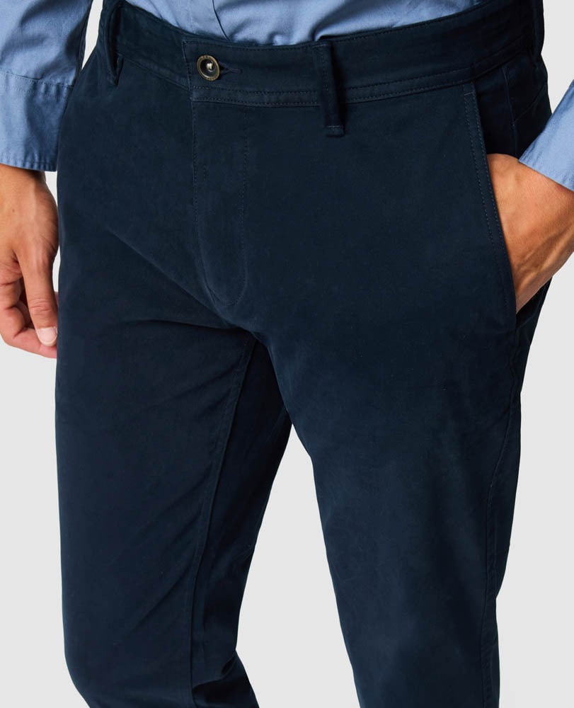 The second generation of our classic Thomas Road chinos are cut from an upgraded fabric that has a more compact construction. Finished with brushed effect, the ultra smooth sateen's luxurious hand feel means ultimate comfort while maintaining a refined look. Woven in Italy, and enriched with a small amount of stretch to allow for greater movement and durability. Designed with straight forward chino styling and our popular custom fit.