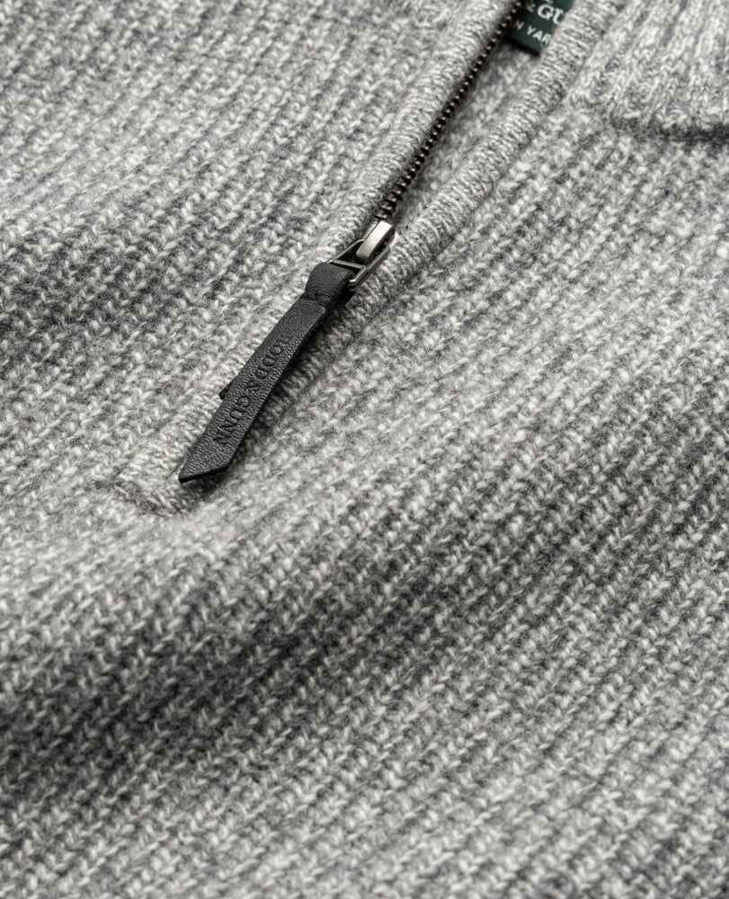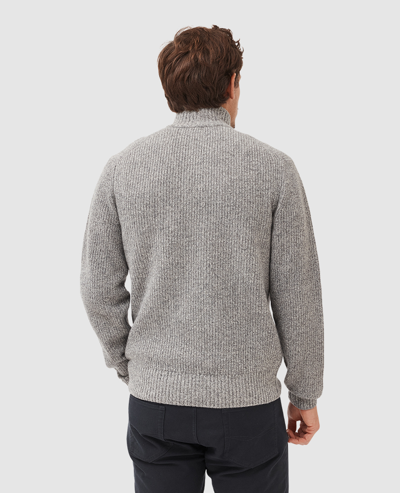 This sweater is expertly crafted from an extra fine lambs wool, textured with a melange yarn. Spun in Italy, knitted with a rib texture on the body, jersey side seams and sleeves, and trimmed with premium YKK zip front.