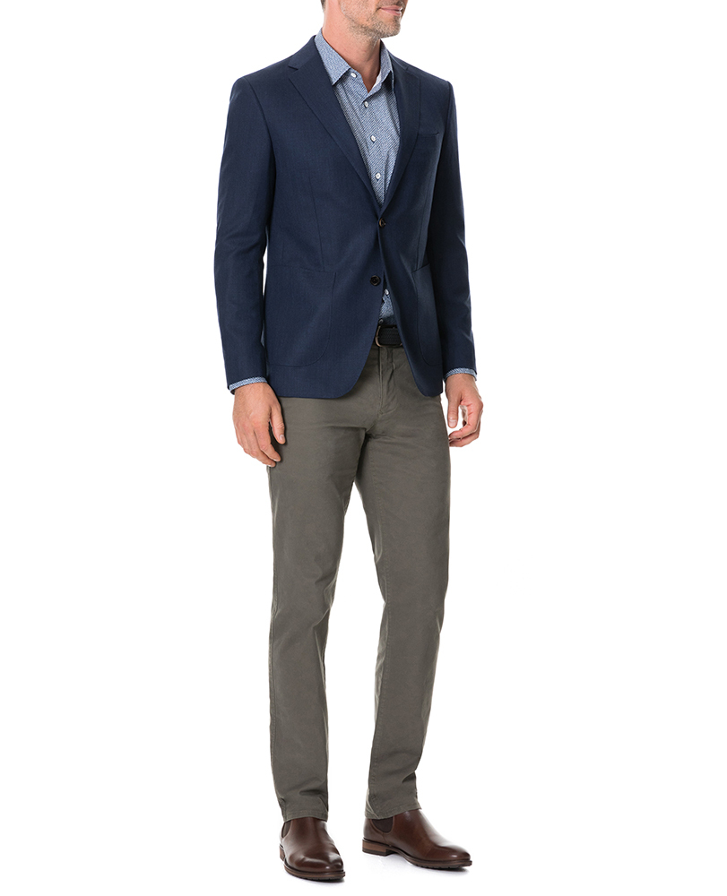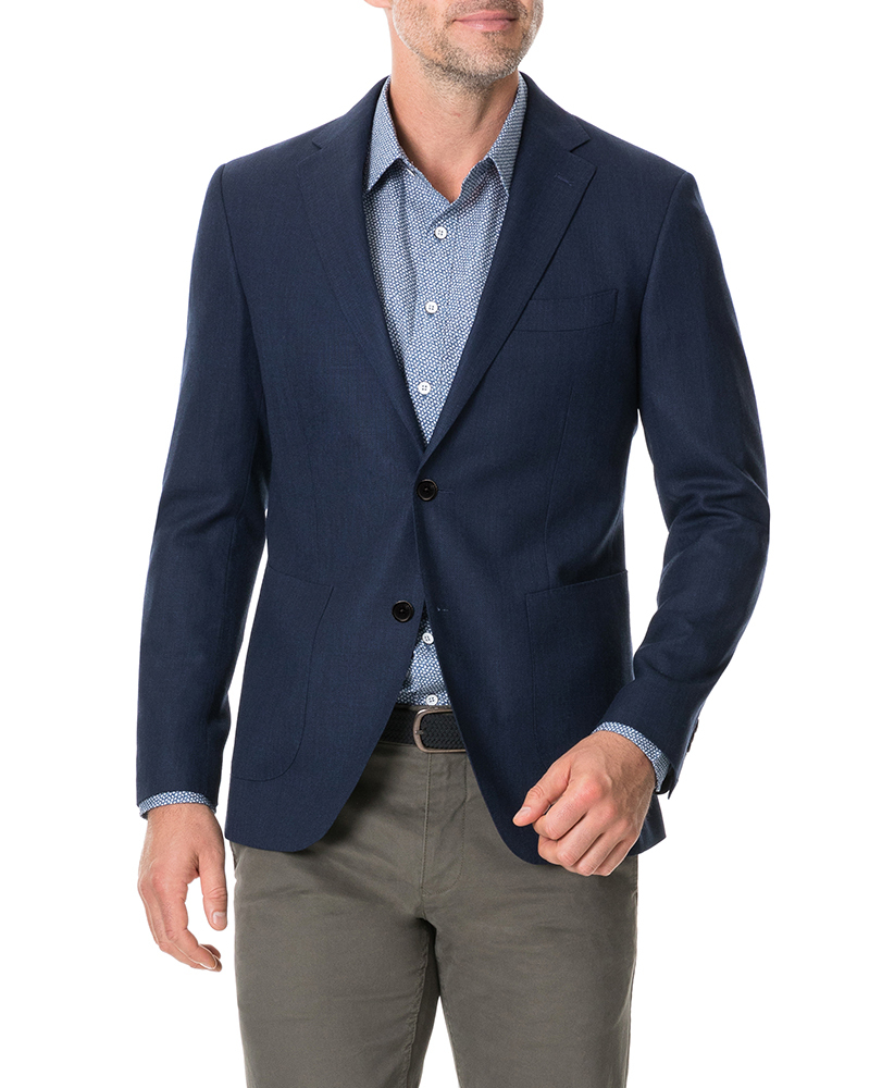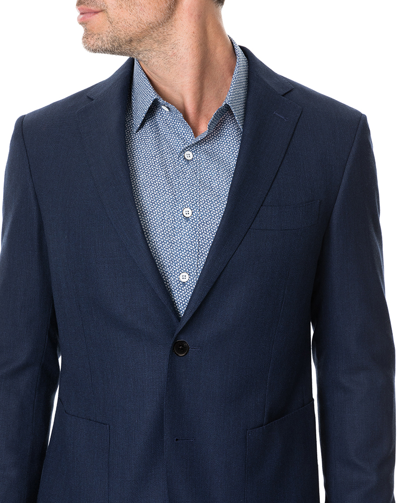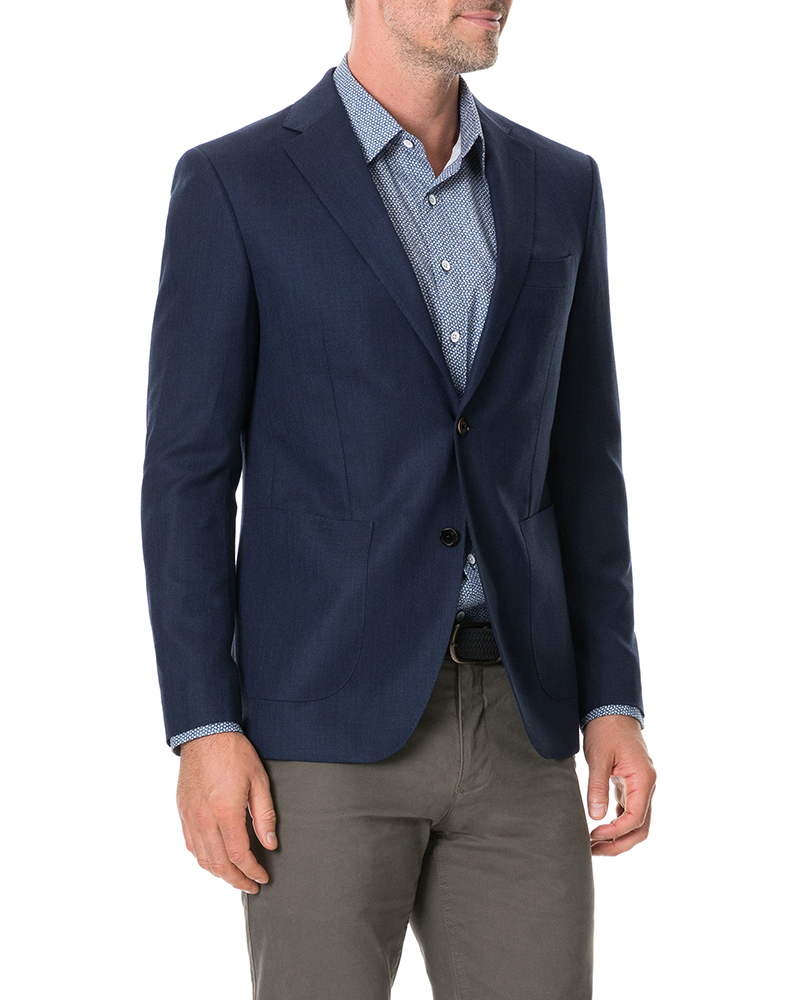 This soft-tailored jacket is cut from a wool-rich Italian fabric, with a sophisticated woven texture. Cut for a sports fit, the jacket is sartorially detailed with a notch lapel, and pick-stitch detail. The interior is lined with a soft-touch taffeta lining, and printed with the braided streams of the Waimakariri River (situated in the South Island of New Zealand).