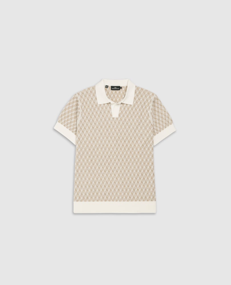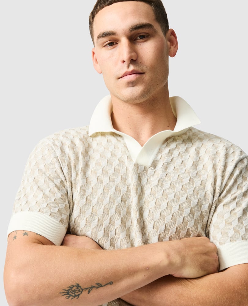 Elevate your summer wardrobe with this expertly crafted knit polo, sporting an intricate, geometric stitch design. Complete with solid, clean collar, placket, cuffs and hem, this lightweight polo ensures breathability and comfort, keeping you cool and stylish all summer long.