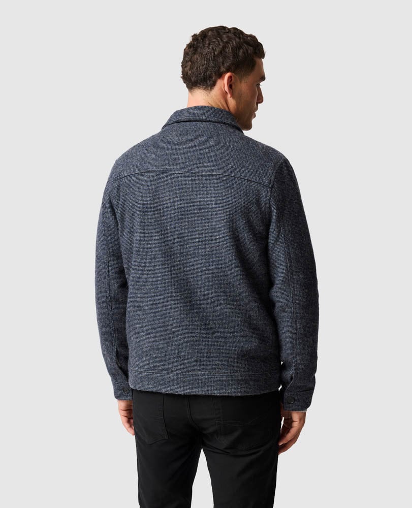 This classic trucker jacket features a subtle micro check adding depth and texture. Made from expertly milled virgin wool fabric in Northern Italy, it provides warmth and durability. The jacket is lined with a premium lining for added comfort and features modern styling, four external pockets and one internal pocket for added functionality.