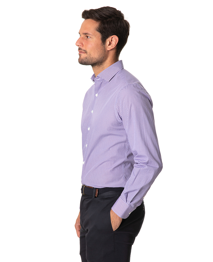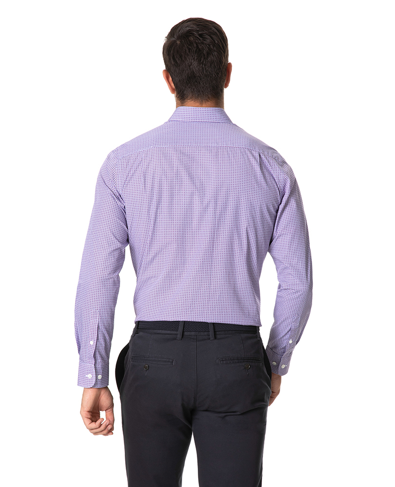 This crisp cotton shirt is patterned with a versatile micro geo print which is a smart way to introduce pattern into your wardrobe. Suitable for professional and smart-casual occasions alike, courtesy of the mill Albini in Bergamo, Italy.