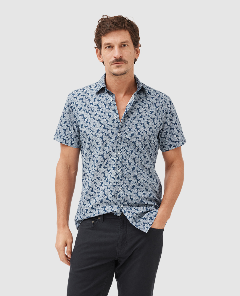Keep cool and stylish in this lightweight shirt. Expertly crafted in Europe, the luxuriously soft fabric features a monochromatic leaf print that will add a touch of understated sophistication to any outfit.